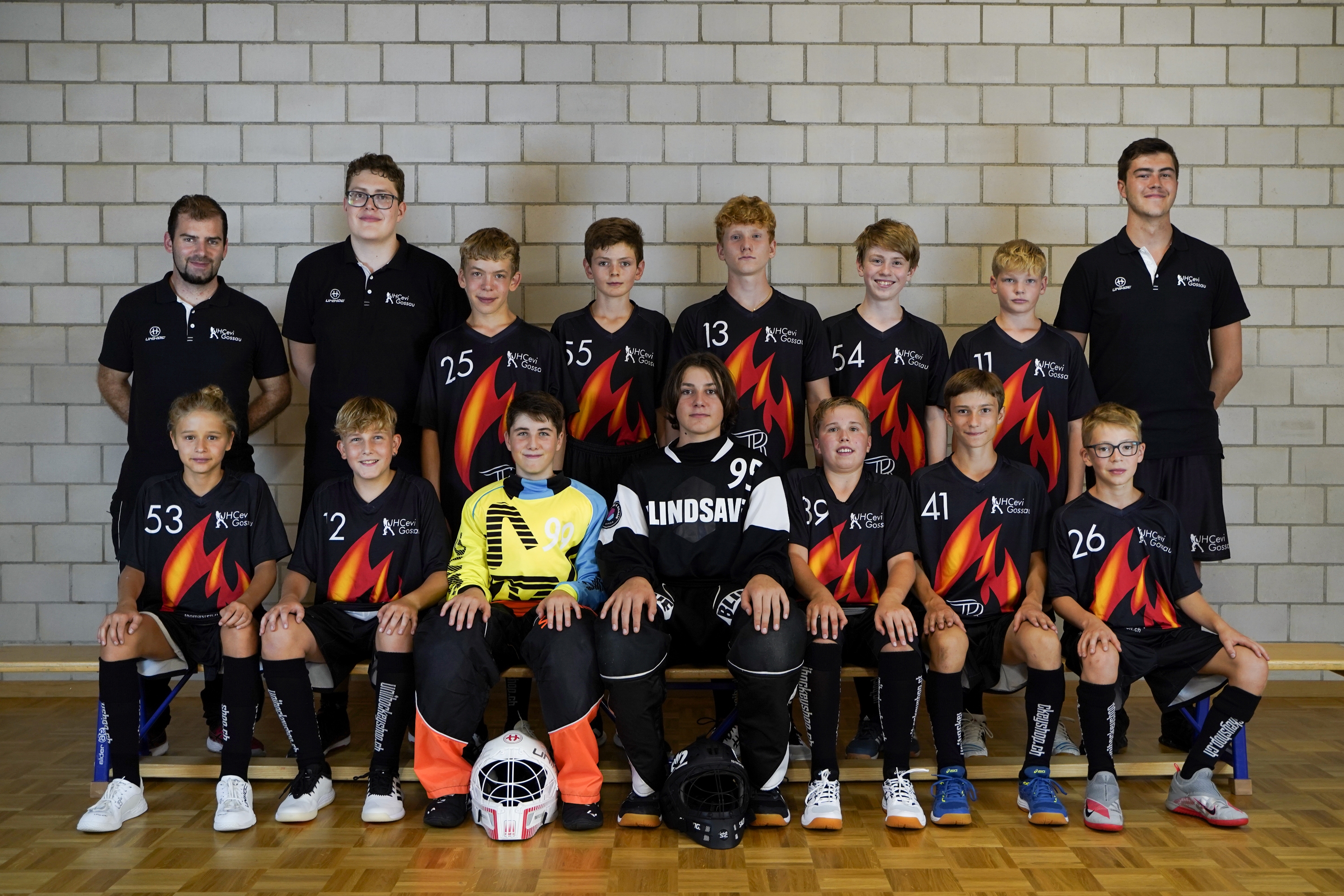 Patrick Reich (Co-Trainer), Michael Walter (CO-Trainer), Joel Herren #25, Leon Jacober #55, Jadon Harast #13, Raphael Mettler #54, Severin Nacht #11, Philip Walter (Trainer).