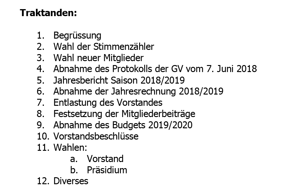 Die Teilnahme an der GV ist für alle Aktivmitglieder, die das Mindestalter gemäss SUHV zur Lizenzierung als B-JuniorIn in der Saison 2018/2019 erreicht haben, obligatorisch. Wer trotzdem verhindert ist, meldet sich bis spätestens am 19. Mai 2019 bei der Präsidentin, Lara Guillod, ab. Bei verspäteter oder keiner Abmeldung muss mit einem zusätzlichen Helfereinsatz oder Ähnlichem gerechnet werden.