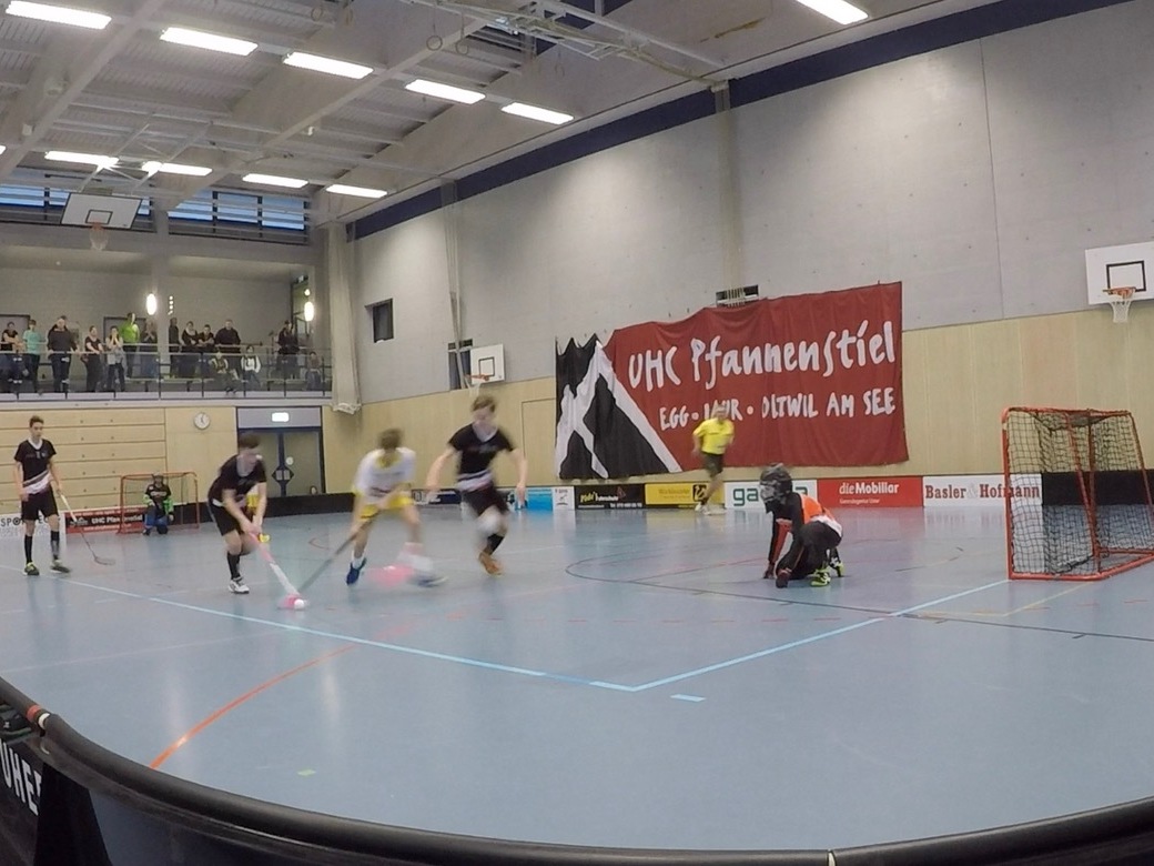 Los ging es gegen GC, die sich im Laufe der Saison immer mehr steigern konnten. Zu Anfang wollten sie wohl ein Zeichen setzen, indem ihr 17er Levi per Bodycheck über die Bande schickte. Für mich mindestens eine zwei Minuten Strafe, dem Schiri nach offenbar nicht. Die ersten Minuten hatten wir mehr Chancen als GC jedoch ohne zählbare Resultate. Es dauerte bis zur neunten Minute, als GC nach einem vermeidbaren Freistoss im zweiten Nachschuss traf. Bitter, waren wir doch eigentlich dominierend. Dennoch erhöhten wir in der Folge den Druck auf's GC-Tor. Yves und Levi verfehlten knapp. Es war eine Frage der Zeit, bis Nik nach gutem Pressing von Yves und Levi einen Fehlpass vom Gegner ins obere Eck zum 1:1 verwerten konnte. Es ging so weiter, Gossau mit guten Chancen aber schlechter Ausbeute. Und wie es dann so kommt, wenn man zu viele Chancen liegen lässt: nach einem Solo vom GC Spieler fälscht Levi einen eigentlich harmlosen Schuss ab, Janis kommt zwar mit der Hand dran, der Ball fliegt aber im Bogen über ihn und Timon schupft ihn statt von der Linie weg auch noch ins eigene Tor. Sehr glückliche 2:1 Führung für GC. Aber wir liessen uns nicht beirren. Das 2:2 lies nicht lange auf sich warten. Gewonnener Zweikampf von Till, Michi liess sich auch durch Stockschläge nicht bremsen, und hämmert die Kugel ins rechte obere Eck zum 2:2. Und weiter ging's: Parade von Janis, Levi holt sich den Ball gibt ab auf Timon, der trifft den schnellen Gegenzug zur erstmaligen 3:2 Führung für Gossau, zugleich Halbzeitstand.